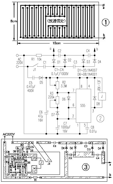 最后需说明的是,用本装置灭蟑螂,若同时利用蟑螂喜欢黑暗、油腻、甜味的习性,其收效会更显著。因此,本装置应放在黑暗、暖和的地方,最好用糖水或香油浸过的棉团做诱饵,有诱饵蟑螂会大量聚集。尤其是晚上,会有大量蟑螂进入这个“陷阱”,而一一被击毙。由于整个电路与市电相连,制作使用一定要注意安全!图3是电路板图。