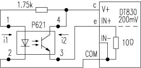 测试电路见图。万用表(以DT830为例)拨至测NPN管挡,在hFE插口的c孔上有2.8V的电压,e孔在表内接200mV测试挡的输入端,e孔与地COM之间接有一个10Ω的电阻。如图接好所测光电耦合器(以P621为例)后,光耦的①、②脚间电压约为1V,流过发光二极管的电流i1约1mA。流过光敏管的电流i2在10Ω电阻上产生压降,量程为200mV的电压表所测的电压就是10Ω电阻上的电压,10Ω电阻起I-V转换的作用。