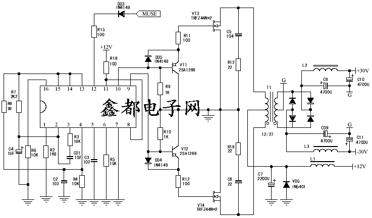 Jensen功率变换器,则采用传统开关电源它激式驱动器驱动四只MOS FET开关管组成的并联推挽电路,其功放变换器电路如附图所示。该汽车功放中利用MOS FET管作为开关管,可以提高电源变压器的工作效率,有利于抑制脉冲干扰,同时还可以减小电源变压器的体积。变换器的振荡器和控制系统全部集成在IC(TL494)内部。TL494原设计为它激式开关电源驱动控制器,内部除含有振荡器,脉宽调制器以外,还有基准电压稳压电路,死区时间控制电路和两组比较器组成的误差检测电路。TL494在该电路中构成它激式变换器,只利用了其振荡器和驱动电路,用作驱动开关管的脉冲信号源,因而与常规用法有所不用。在该电路中,TL494第5,6脚外接时间常数电路(C3,R5),振荡器产生80kHZ的脉冲信号,经TL494内部双稳态触发器控制,变成两路时序不同的驱动脉冲,驱动两组驱动放大器。TL494内部两组驱动级,由第9,10脚输出时序不同的正向脉冲。为了避免在两路脉冲交替处推挽开关管VT3,VT5和VT2,VT4同时导通,TL494的第四脚外接R6,C2,R4设定死区时间 。一组驱动脉冲使推挽电路一臂导通后,相隔一死区时间,才发出另一组驱动脉冲,使另一臂导通(第四脚电压越高,死区时间越长)。TL494第1,2脚为两组取样放大器的同相和反相输入端,可控制内部比较器组成的脉宽调制器设定的占空比。在该变换器中,TL494各脚功能及应用如下: