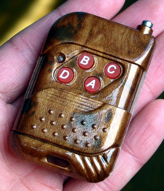 这里提供的发射机体积非常小巧,体积只有58x38x8毫米,采用桃木花纹的优质塑料外壳,带保险盖,防止误碰按键,天线拉出时长13厘米,遥控器只有20克。
