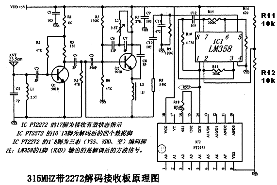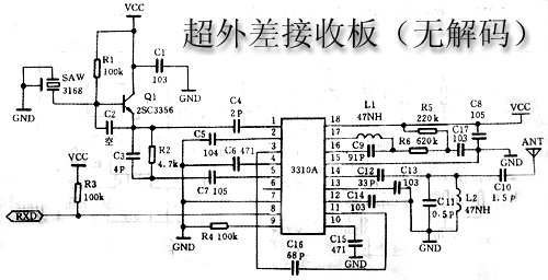 从外接天线接收的信号经C10耦合到L2、C11组成的选频网络进行阻抗变换后输入RX3310的内部高频放大器输入端14脚,经芯片内的高频放大后(增益为15~20DB)的信号再经混频器与本机振荡信号(316.8M)混频,产生1.8M的中频信号,此中频信号经内部中频放大后由第3脚输出,再进入比较器放大整形,最后数据从第8脚输出。
