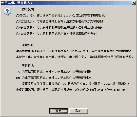 5、本软件追求的是体积小巧玲珑,使用简单方便,功能实用,因为是站长自己写给站长自己用的,所以,是根据自己的实际需要而写的,照出的照片和录像文件都是使用非常规则的命名,大家可以很方便的删除这些文件,减少电脑垃圾,适合大多数用户收藏使用!