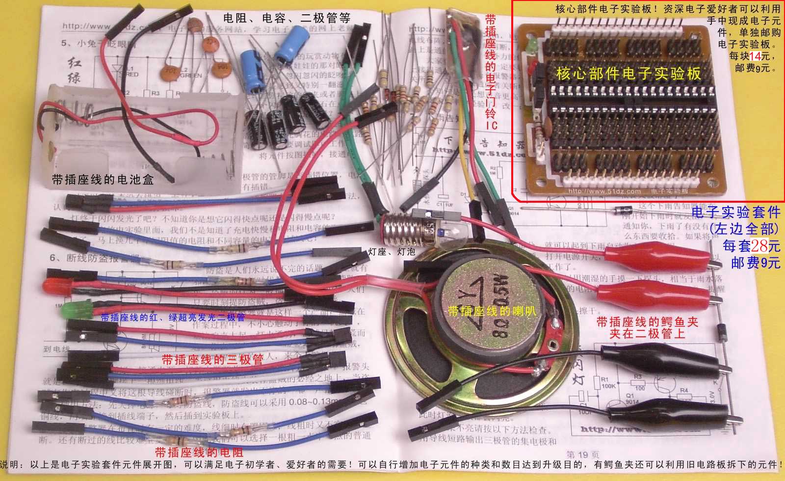 用一把电烙铁、几个电子元器件,在电路板上组装一个报警器、收到音机、无线话筒或者是小功放先好好玩一下,这个过程中你无需知道电路原理,只要搞清电阻的大小,晶体管的极性及按电路图连接就OK了。