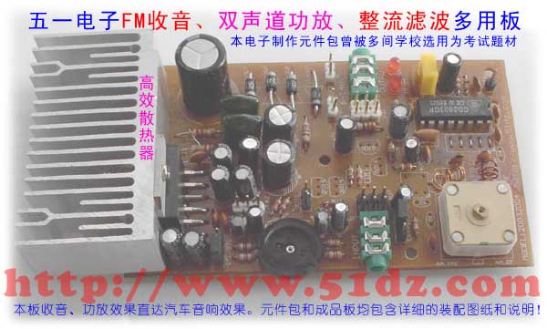 电子制作是综合能力的体现,从中可学到不少技术和经验,欢迎选购制作。一板两用,既可当FM收音机用,又可以当立体声功放用。给用户留了更多的设计空间,带有整流滤波,输入输出插座。可以接交流电也可以接直流电。