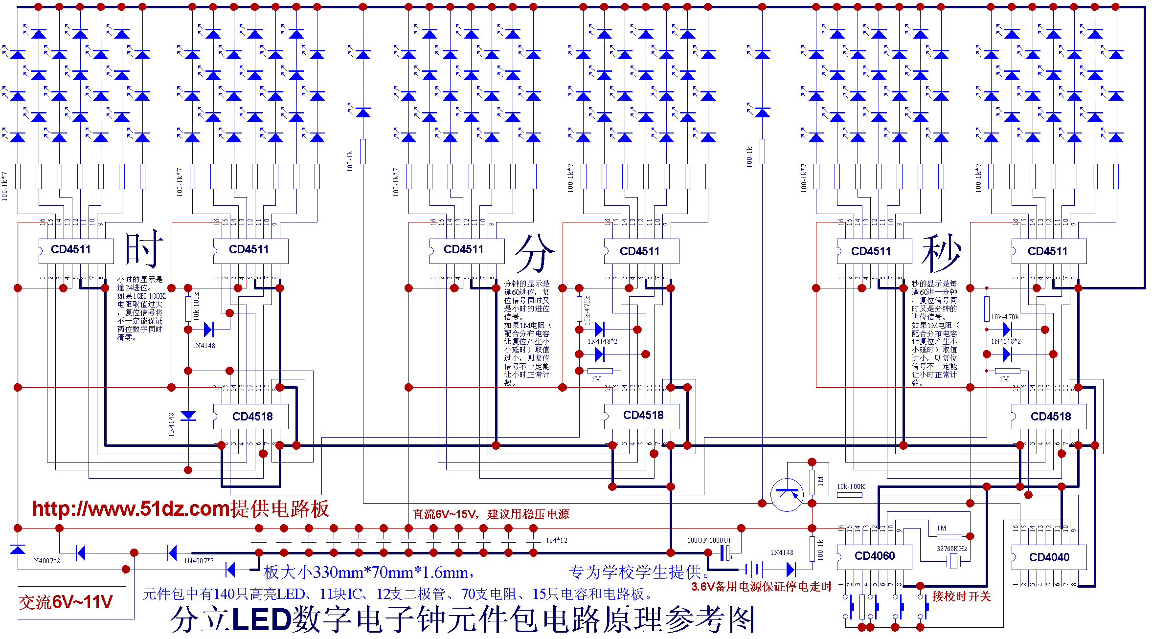 2、纯硬件电路,石英晶体振荡器为时间基准,走时精度高。主要元件:4511六支、4518三支、4040和4060各一支、超亮度发光管130只等元件。